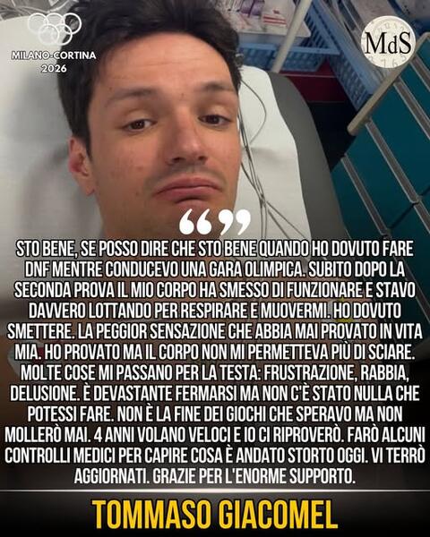 Migliaia i commenti di incoraggiamento per Giacomel sui social uno per tutti quella del Presidente della Provincia di Trento Fugatti che ben esprime il sentiment comune a tutti: "Lo sport è fatto di vittorie, ma anche di momenti duri e imprevisti. Quello che conta davvero è la forza di rialzarsi, la determinazione e il coraggio di non arrendersi mai. Il tuo ritiro nella mass start delle Olimpiadi, mentre eri in testa, deve essere stato un colpo difficile da accettare. Ma sapere che gli accertamenti medici hanno dato esito negativo è la notizia più importante: prima di tutto viene la salute. Il Trentino è con te, orgoglioso del tuo impegno, della tua passione e dei valori che rappresenti. Forza Tommaso, tornerai più forte di prima." ha scritto Fugatti su facebook.